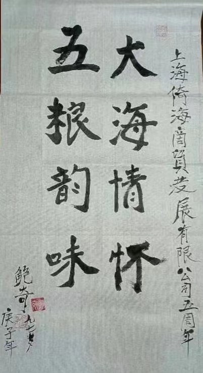 海军鲍奇将军为海得来酒题词。“大海情怀,五粮韵味”